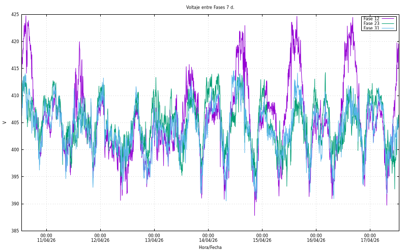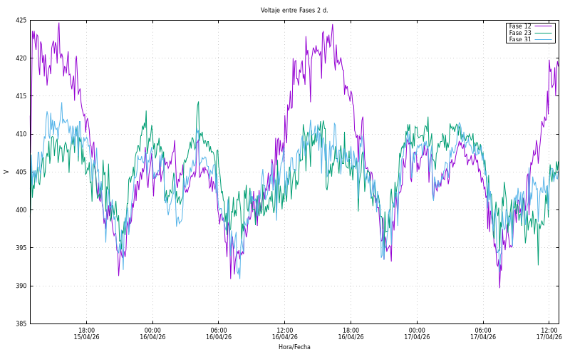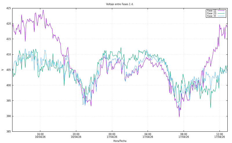 Voltatge entre fases (V). Fase12: 410,90 Fase23: 398,00 Fase31: 404,40 |