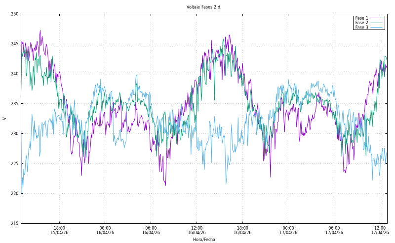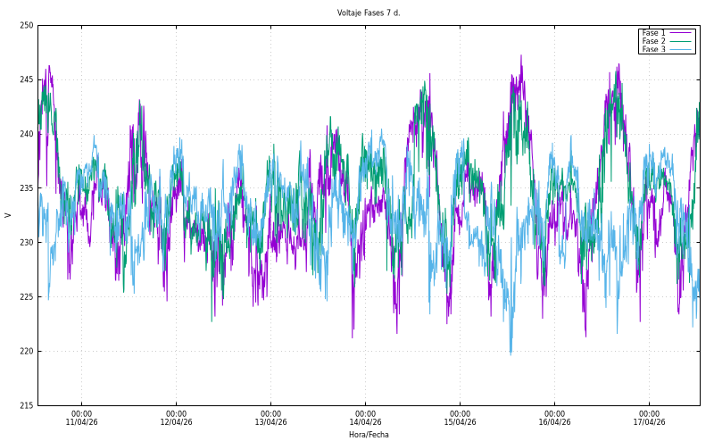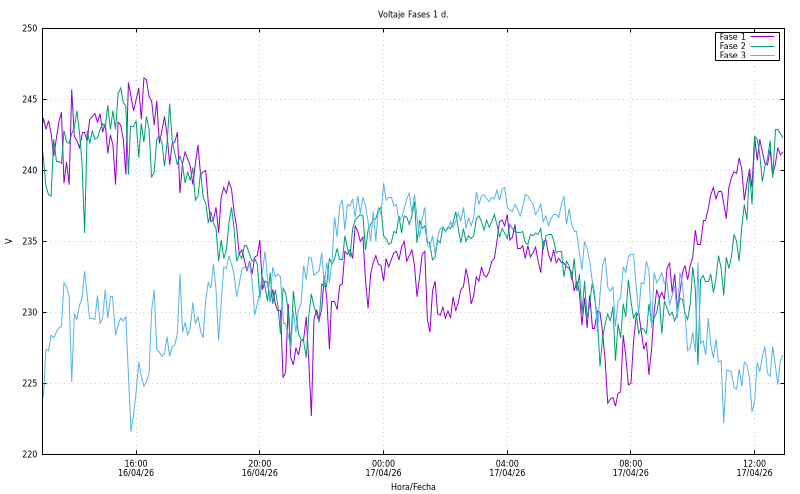 Voltatge per fase (V). Fase1: 240,90 Fase2: 233,60 Fase3: 226,00 |